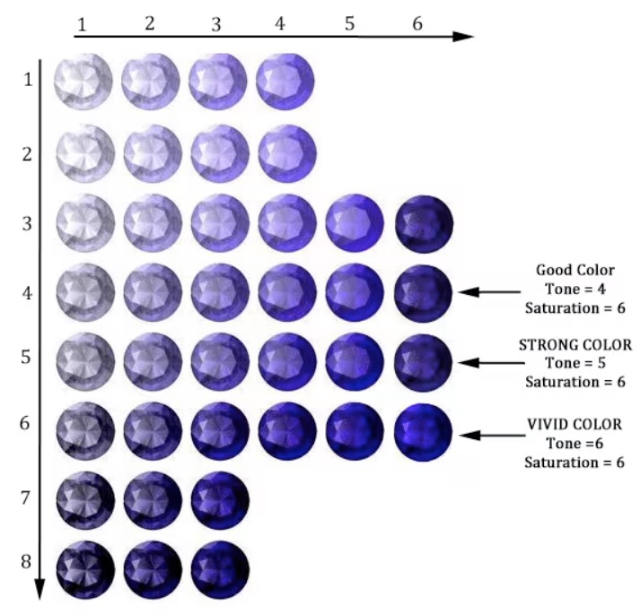 • Геммологи, использующие шкалу оценки цветных камней GIA (Геммологического института Америки), обычно оценивают танзаниты прекрасного цвета как «GIA vB5/6». Этот насыщенный и яркий цвет высоко ценится и пользуется широким признанием. Для ценителей драгоценных камней особенно востребован самый редкий сорт — часто называемый «инвестиционным танзанитом», — который составляет менее 1% от всей добычи и оценивается как «vB6/6».